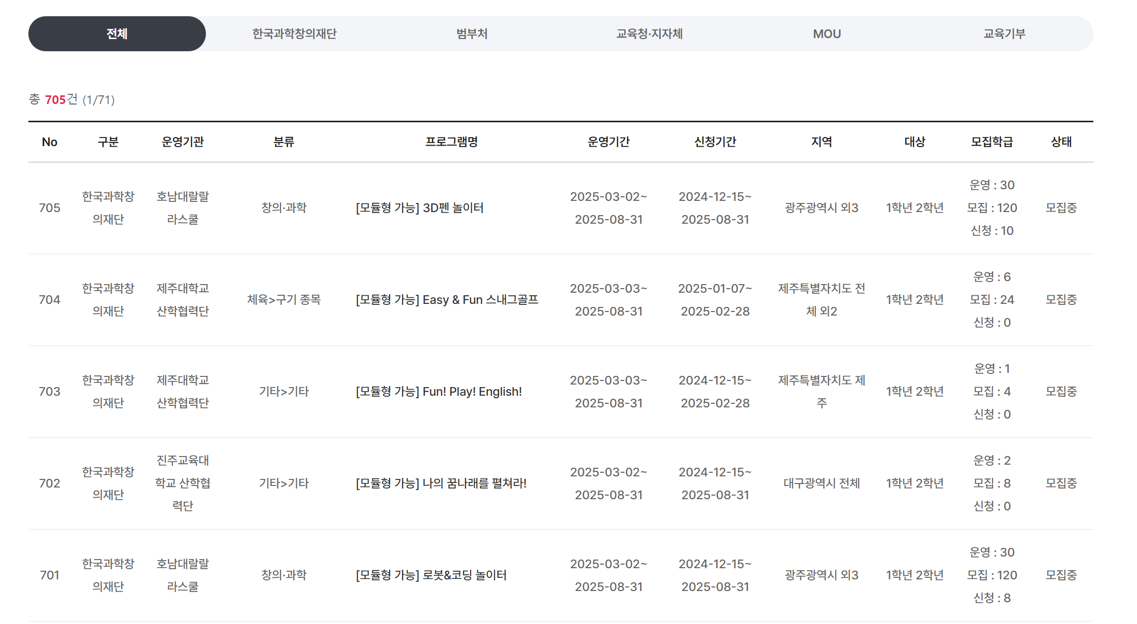 각 학교 일정/상황에 따라 안내문을 받아보시고 신청하시면 됩니다. 그 밖에도 각 기관에서 모집 중인 프로그램도 있으니 검색 후 신청가능합니다.